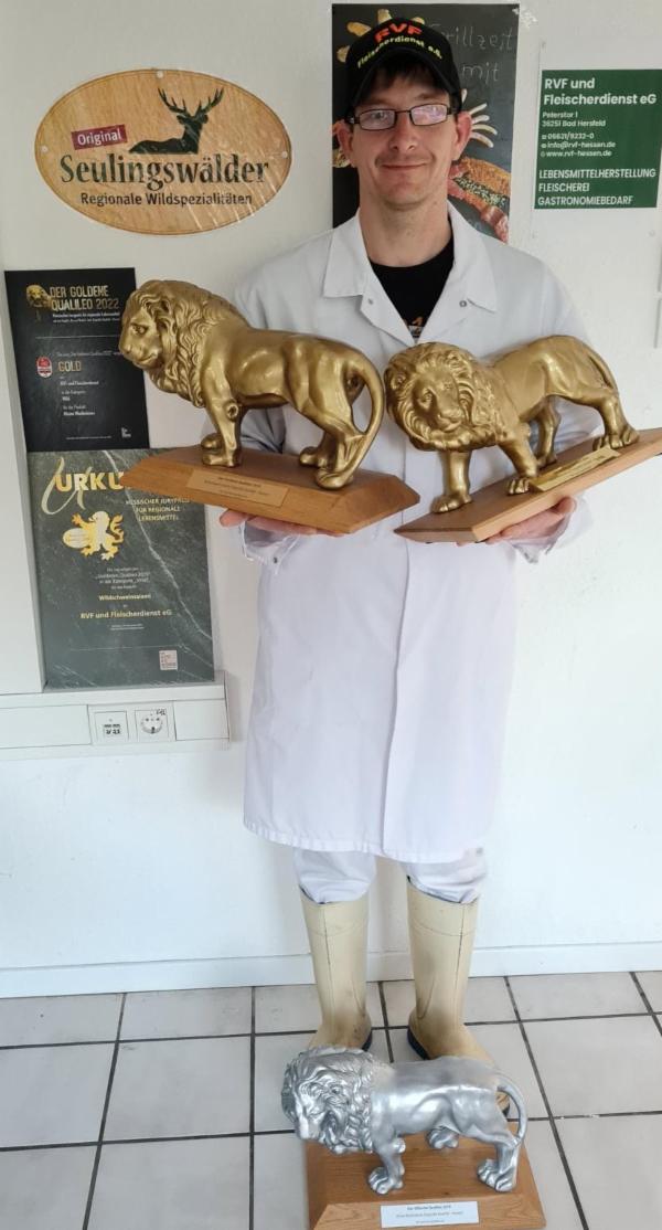 Der goldene Qualileo wurde uns in der Kategorie "Wild" für unseren ausgezeichneten Rehschinken verliehen. Die Seulingswälder Wildspezialitäten sind auch in diesem Jahr wieder ein Garant für Qualitätsprodukte aus unserem Haus. Unser stolzer Produktionsmeister Christian Köhler mit einem Teil "seines Rudels" - den Preisen der letzten drei Jahre.